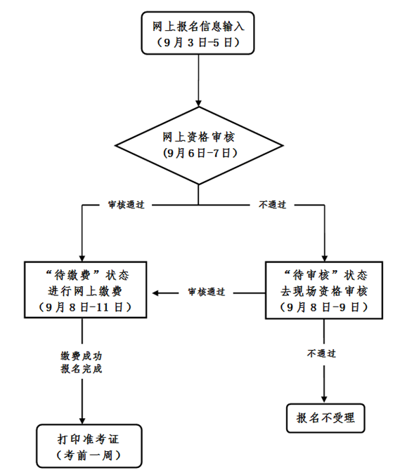 本次考试报名网上信息输入时间为9月3日9时至8日17时,网上资格审核时间为9月9日-10日,网上资格审核未通过者(9月11日8时后仍为“待审核”状态的)需前往现场进行资格审核,审核时间为9月11日至12日,网上缴费时间为9月11日8时至12日18时。
